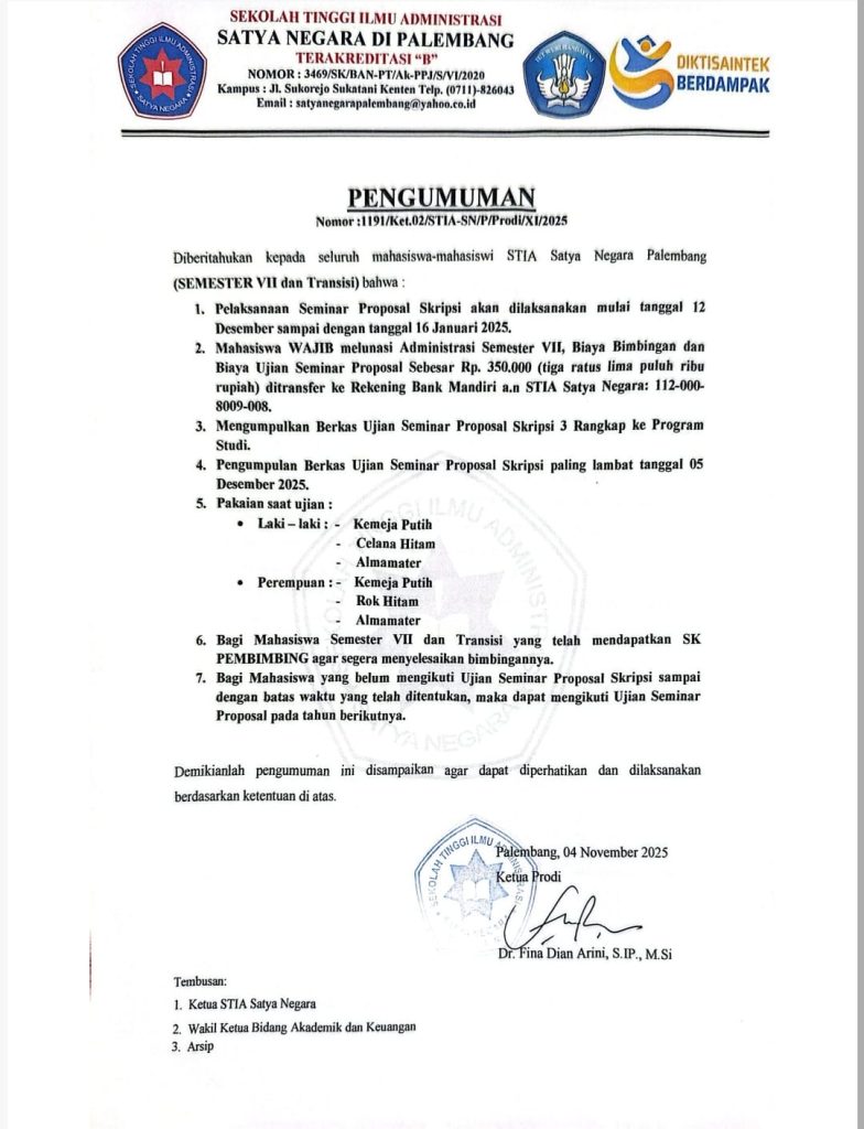 PENGUMUMAN PELAKSANAAN SEMINAR PROPOSAL SKRIPSI TAHUN AKADEMIK 2025/2026 4 November 2025 | Tidak ada komentar Uncategorized