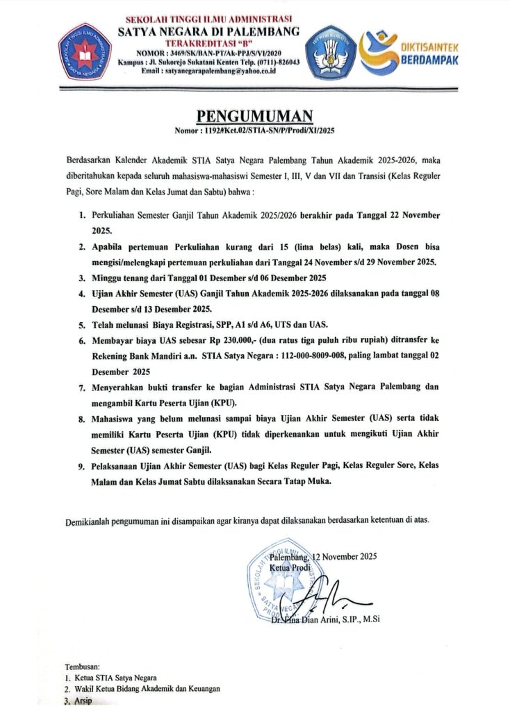 PENGUMUMAN PELAKSANAAN UJIAN AKHIR SEMESTER (UAS) GANJIL TAHUN AKADEMIK 2025-2026 12 November 2025 | Tidak ada komentar Uncategorized