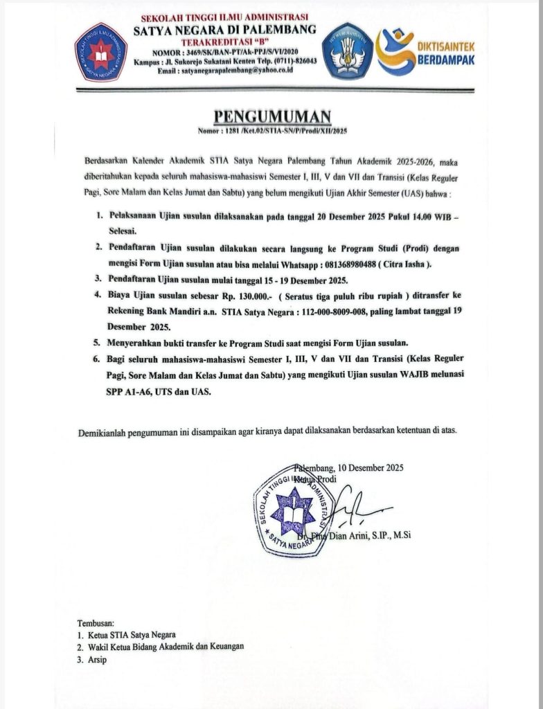 • PENGUMUMAN AKHIR PELAKSANAAN UJIAN KULIAH KERJA ADMINISTRASI 24 Desember 2025