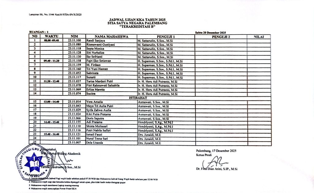 Jadwal Ujian Kuliah Kerja Administrasi (KKA) Periode IV Tahun Akademik 2025-2026 18 Desember 2025 | Tidak ada komentar Uncategorized